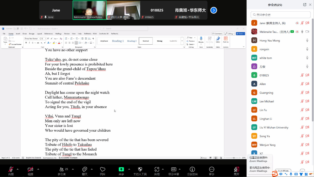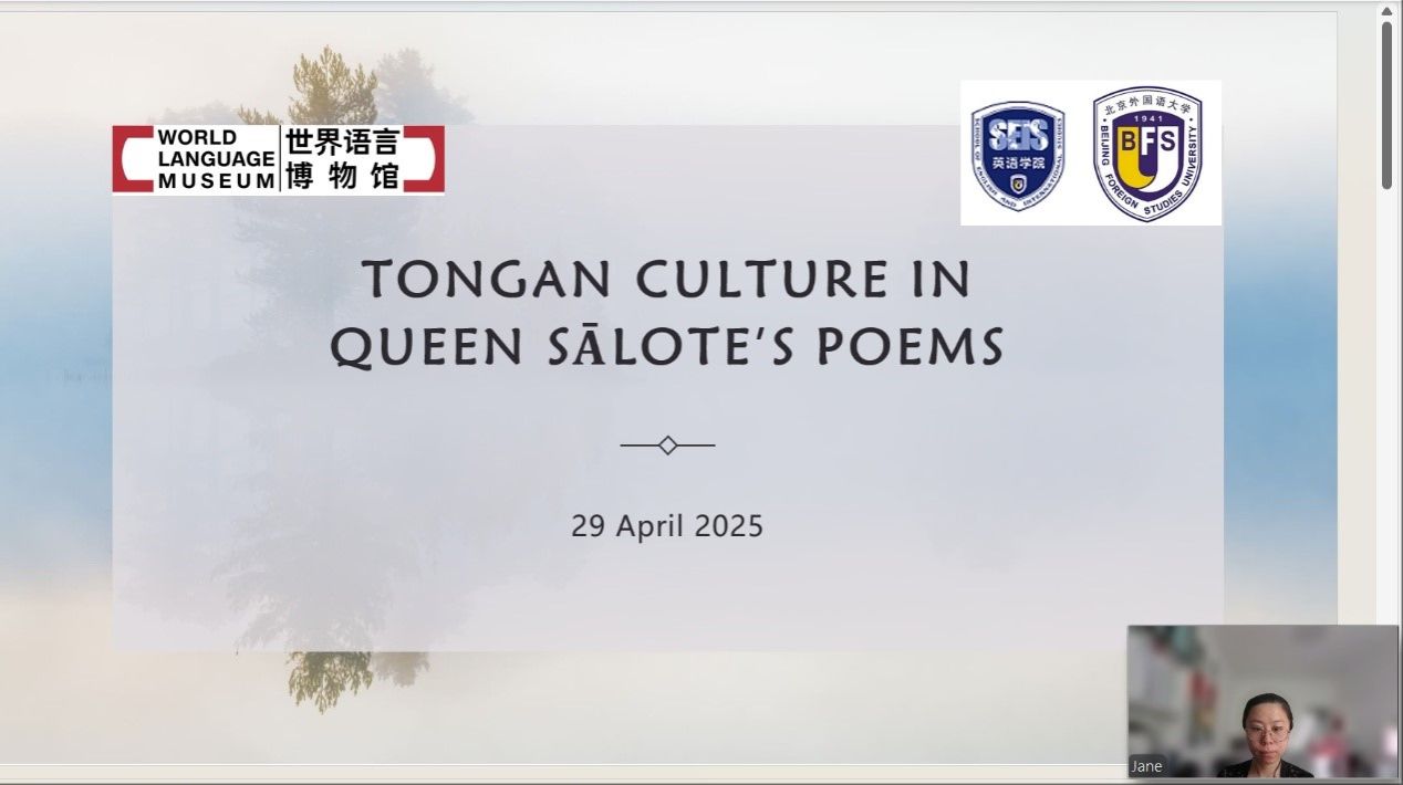2025年4月29日下午,应万象城娱乐awc线路万象城娱乐awc线路南太平洋研究中心和世界语言博物馆的邀请,汤加语外国专家梅莱奈伊特·塔乌莫艾富拉乌(Melenaite Taumoefolau)博士在线上做了题为“夏洛特女王诗中的汤加文化”(Tongan Culture in Queen Sālote’s Poems)的讲座。讲座由万象城娱乐awc线路教师李菅主持,来自校内外多名师生参加了本场讲座。